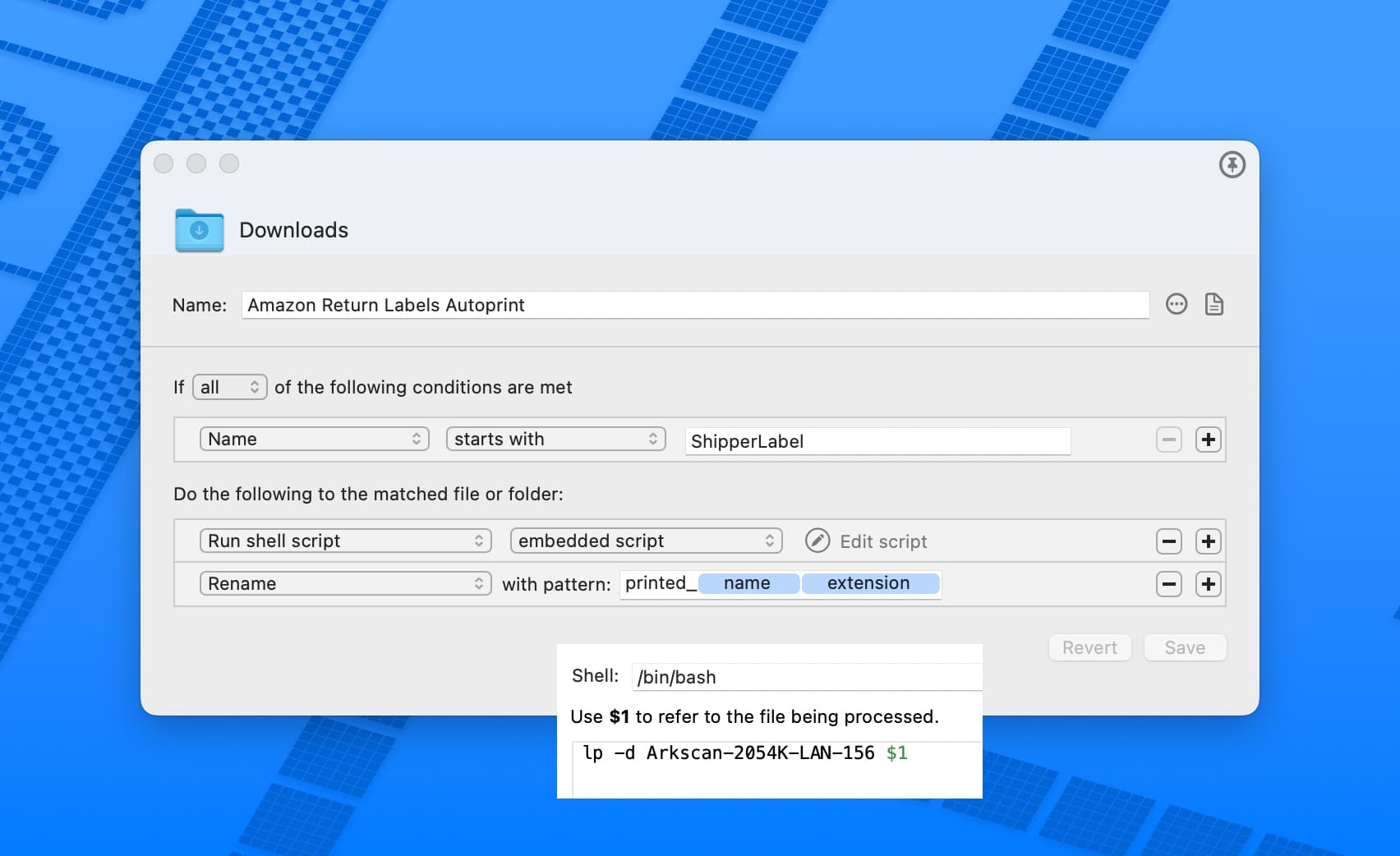 I have one Hazel action for the packing slips print settings, and another for the files that match the art print settings, with the embedded shell script set up with the relevant options.