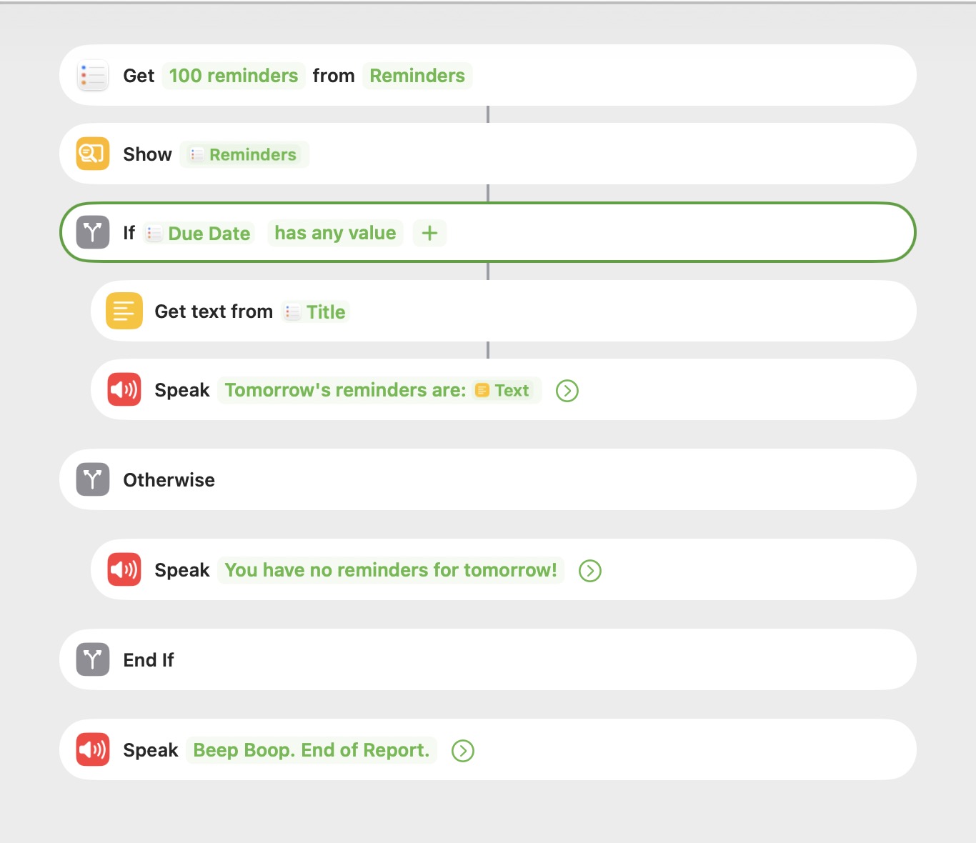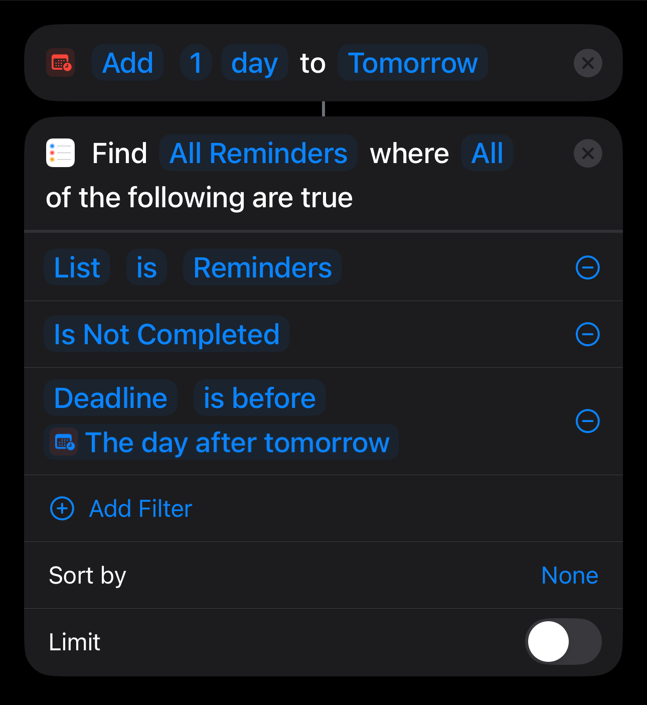 Hi: I was creating a shortcut to show me only the Reminders that have a “Date” of “tomorrow”. I’m pulling from my “Reminders” List specifically (and not the 20 others I have). But when I set “Due Date” to “has any value”, I get EVERY Reminder, even those that are only location-based, and have no Date assigned. Because I thought I was losing my mind, I added a “Show Reminders” action and it’s showing all of the Reminders it pulled, and I can confirm visually there are Reminders with No Date and others with Dates. But at the next step, it speaks Every Reminder. And this seems so silly and obvious. I have Due Date configured as “Medium” with No Time. If anyone has a suggestion as to what I’m missing or the logic behind why it’s behaving that way, I would greatly appreciate your insight. I’m running macOS 26.1 and iOS 26. 1. I’m creating the shortcut on the Mac. Thank you!